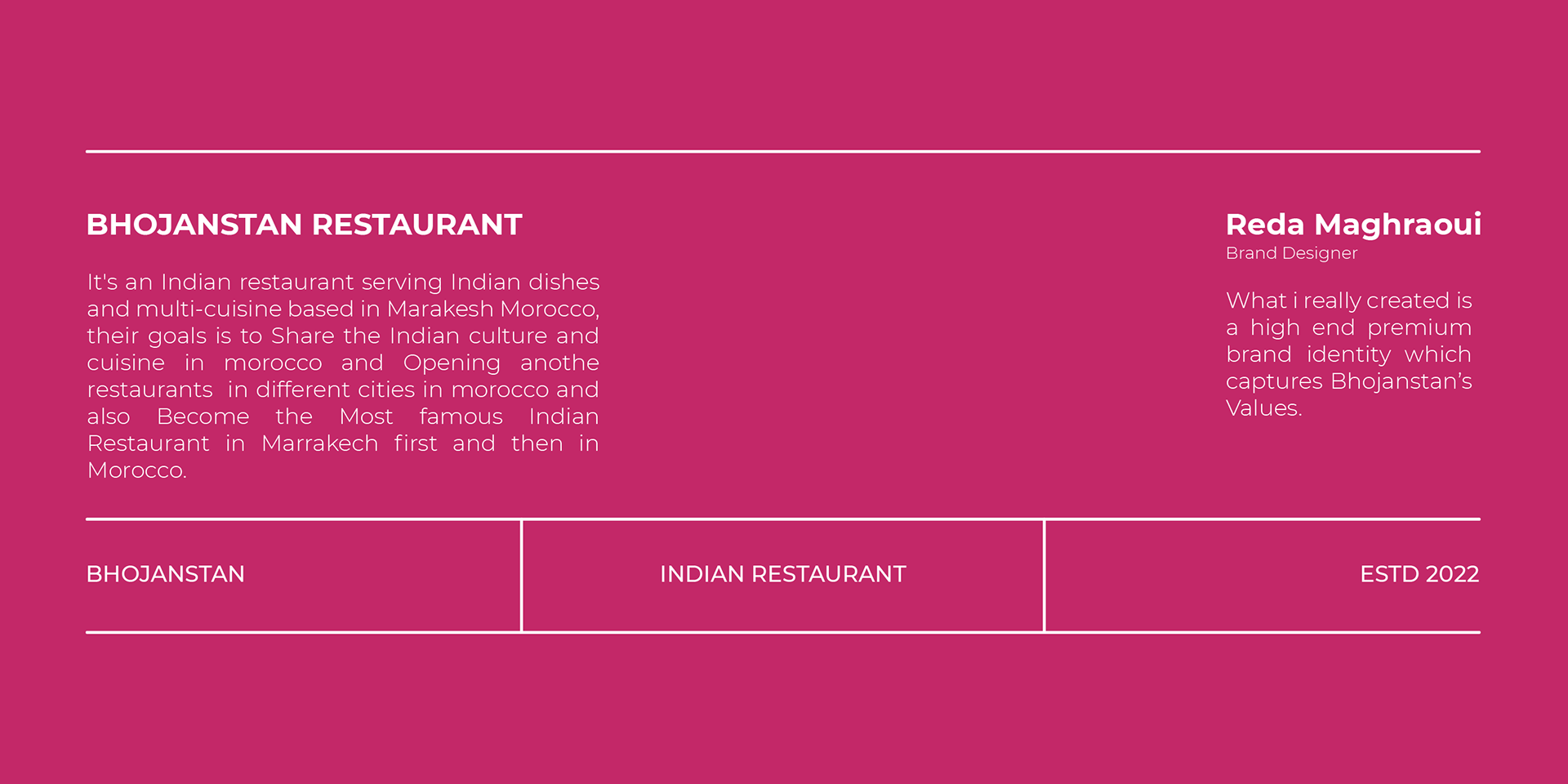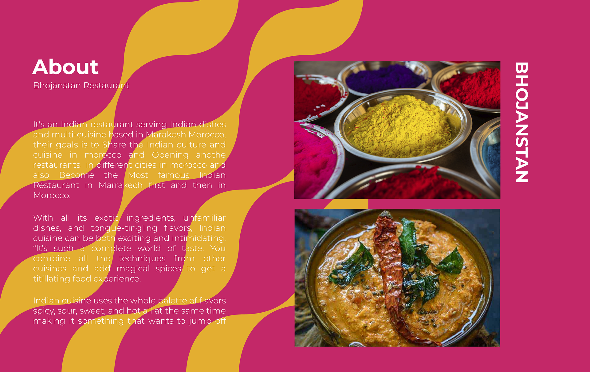 It's an Indian restaurant serving Indian dishes and multi-cuisine based in Marrakech Morocco, their goal is to share the Indian culture and cuisine in morocco and Opening other restaurants in different cities in Morocco and also Become the Most famous Indian Restaurant in Marrakech first and then in Morocco. What I really created is a high-end premium brand identity that captures Bhojanstan’s Values.