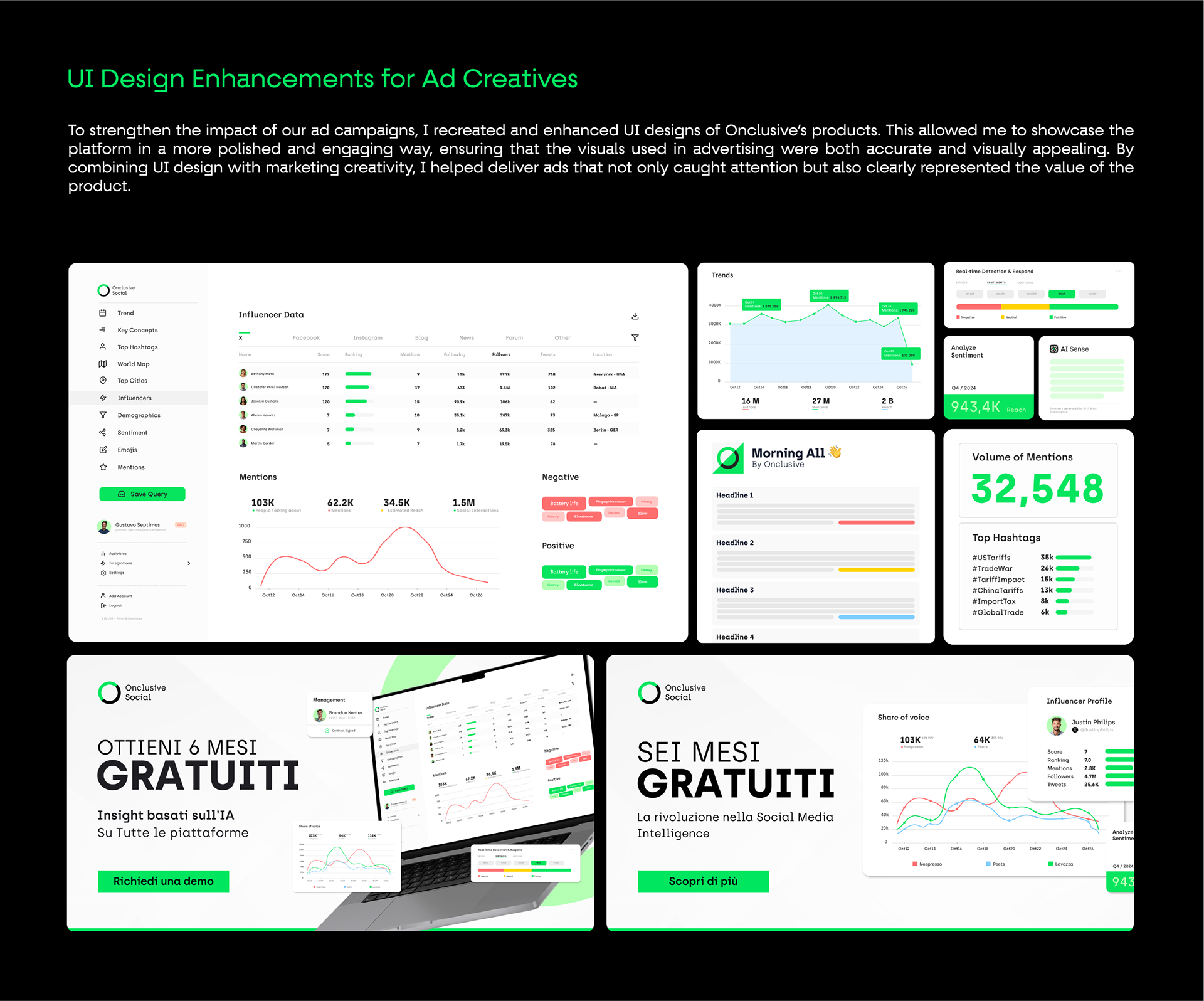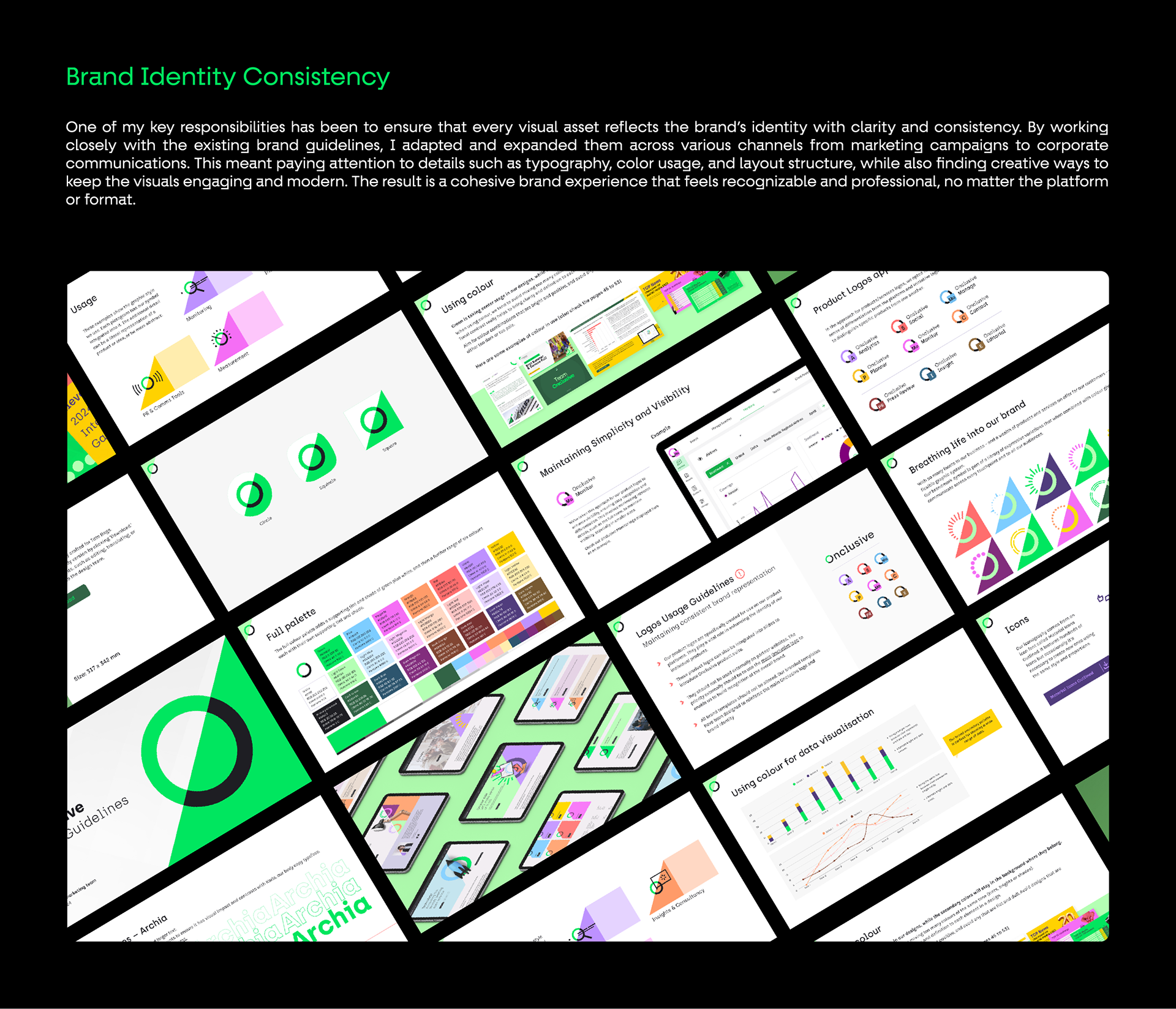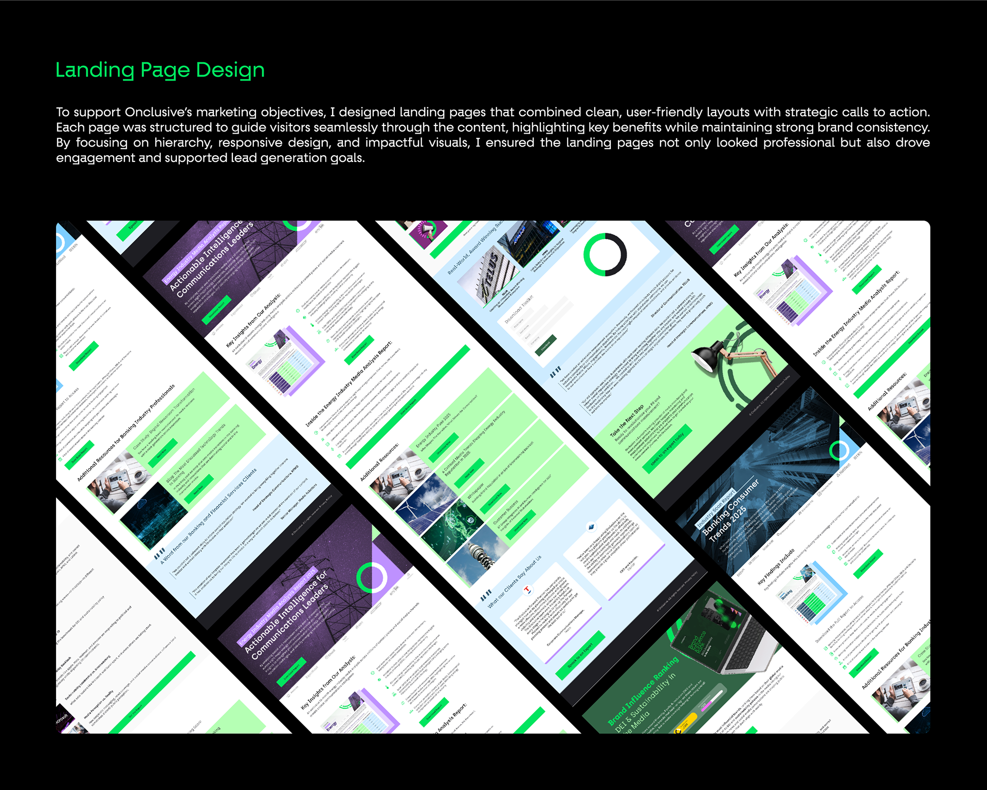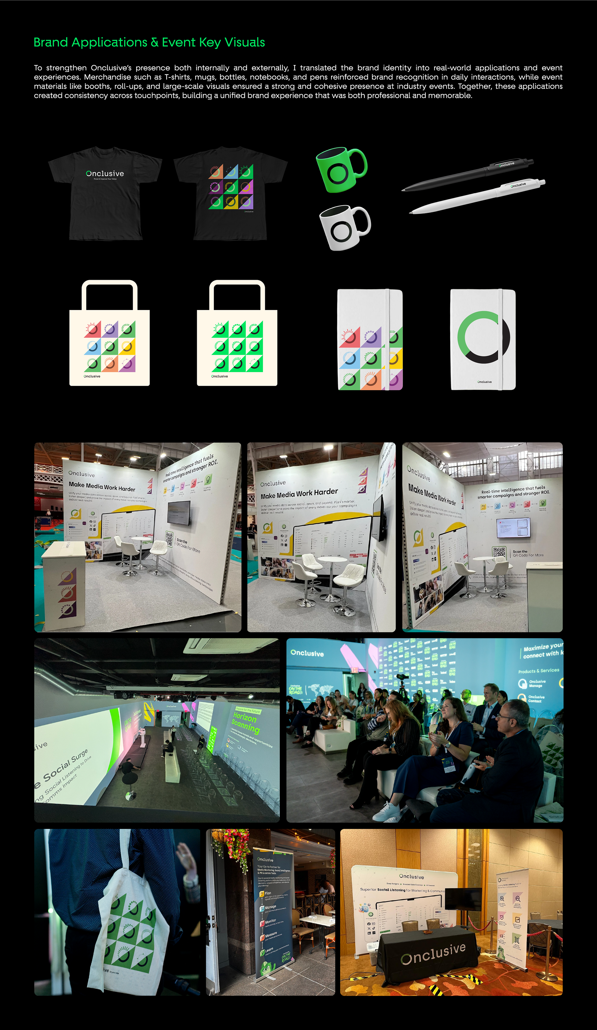 This project showcases my work as a Marketing Designer at Onclusive, where I contributed to brand identity, marketing campaigns, digital assets, event visuals, and product UI enhancements. The portfolio highlights how I maintained brand consistency across multiple touchpoints, developed creative campaigns and social media systems, designed landing pages and reports, and extended the brand into real-world applications and event experiences. Each piece reflects a balance of creativity and strategy, demonstrating my ability to deliver impactful designs that support business goals and enhance brand recognition.